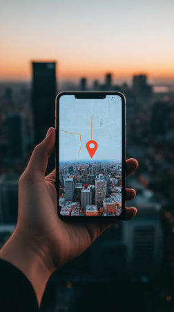 Hand holding smartphone displaying navigation app with location pin over blurred cityscape background during sunset, showcasing modern travel and gps technology