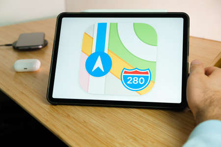 Apple Maps logo on the screen of iPad tablet. March 2021, San Francisco, USA