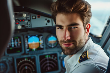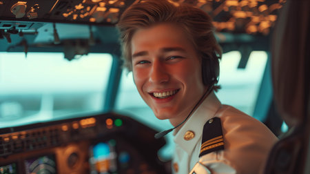 This close-up shot features a confident pilot inside the cockpit, showcasing professionalism and engagement. The image captures the essence of aviation, reflecting the pilot's dedication and focus.