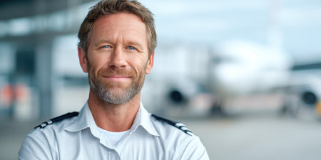 In cinematic realism, a male airline captain stands authoritatively next to a passenger airplane, radiating professionalism and confidence, banner