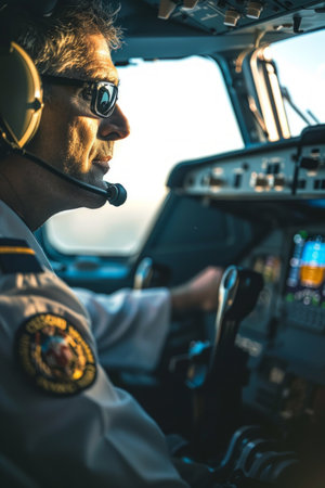 Male pilot wearing uniform and headset checking flight instruments, navigating with focus and expertise during an evening flight