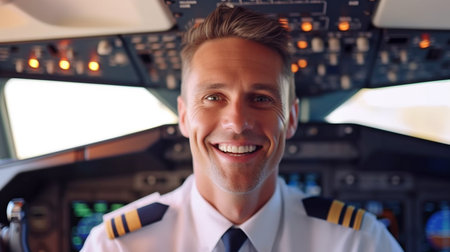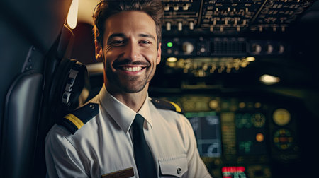 Portrait of a smiling male pilot in a cockpit of a passenger plane. AI generative