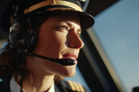 A skilled female pilot concentrates on her task in the cockpit, wearing a headset and uniform. The afternoon sun highlights her focused expression, showcasing her professionalism and dedication.