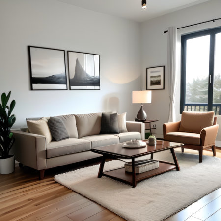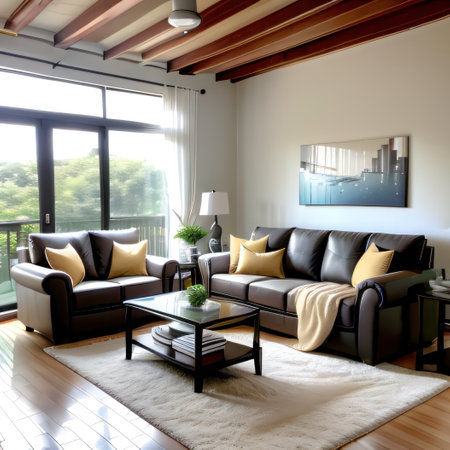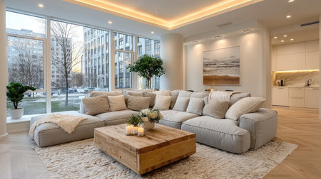 A spacious and elegantly designed living room featuring large windows, modern furniture, and decorative plants
