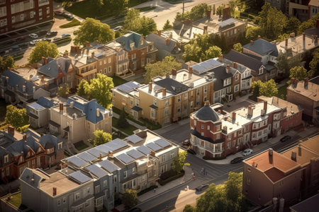 aerial view of solar panel rooftops on urban buildings, created with generative ai