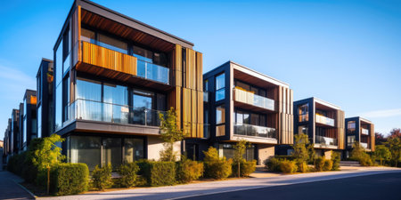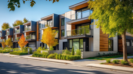trendy row of houses neighborhood illustration sleek contemporary, windows terraces, street trees trendy row of houses neighborhood