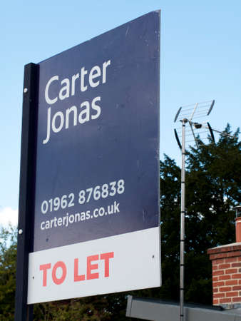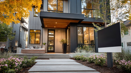 A modern real estate agent stands outside real housing property with blank sign in front of entrance during season