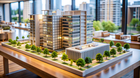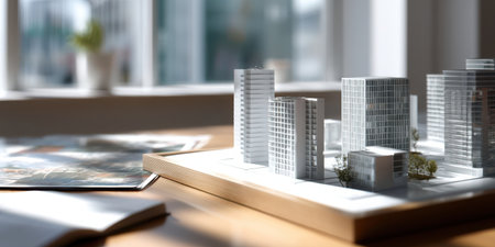 Modern architectural model of high rise buildings on wooden table with blurred background in bright office