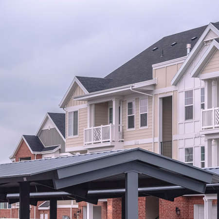 Square frame Undercover open parking for cars at an apartment complex under a grey sky