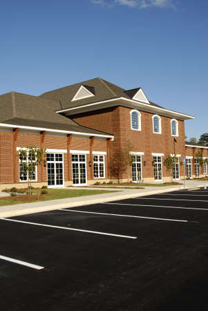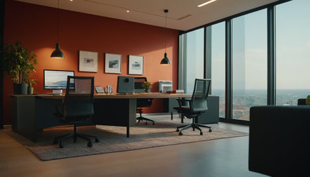 Contemporary office building exterior in bustling urban cityscape with modern architectural design