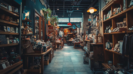 A vibrant interior view of an eclectic shop filled with vintage items, wooden shelves, and unique decor in a cozy atmosphere.