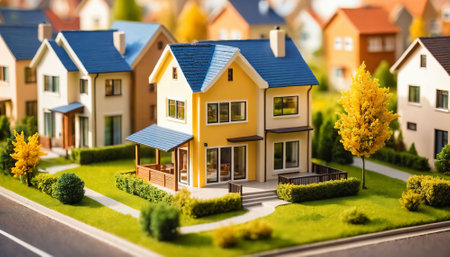 A row of charming, illuminated model homes stands in a perfect line against a vibrant green background. Each house, with its warm lights glowing from within, represents a unique dream of homeownership, community, and suburban tranquility. This idealized neighborhood symbolizes real estate investment, property development, and the concept of finding the perfect place to call home.