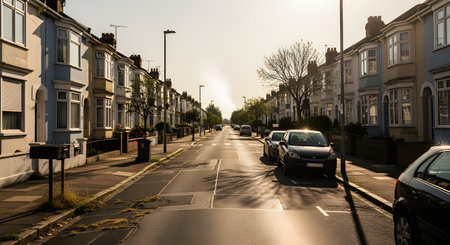 A quiet suburban residential street lined with traditional terraced houses, bathed in the warm golden light of a setting sun. The perspective leads down the asphalt road, parked cars on the side, capturing a peaceful evening atmosphere in a neighborhood.