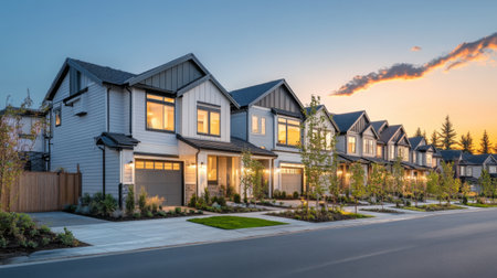 A modern twin house community, with a row of homes showcasing clean lines, contemporary design, and matching facades.