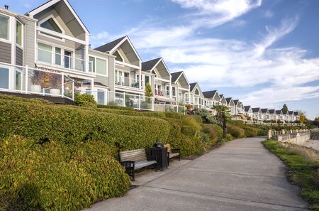 Focus on the upper storey of townhomes with blue sky background on a sunny day. The houses have wood, brick, and concrete exterior wall.
