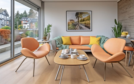 A stylish modern living room interior design with vivid and warm tone colors in the apartment. Generative AI AIG27.