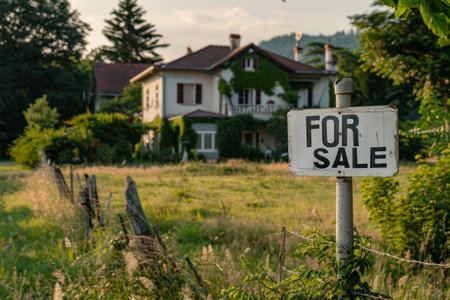 Sold Home For Sale Real Estate Sign In Front of House With Beautiful Sunset, For Sale Real Estate Sign in Front of New House. Real Estate Business Concept, AI Generated