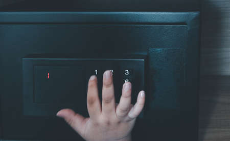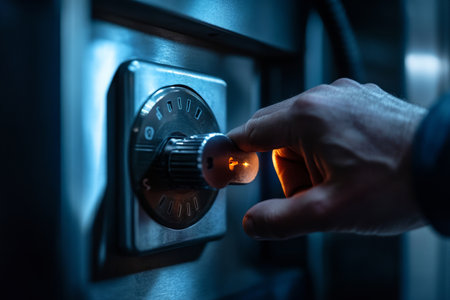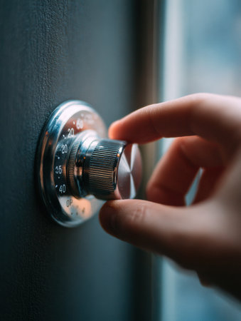 A hand is adjusting the combination dial of a safe, emphasizing security and the importance of protecting personal belongings in a private setting.