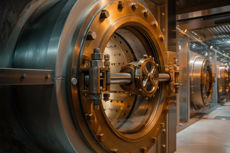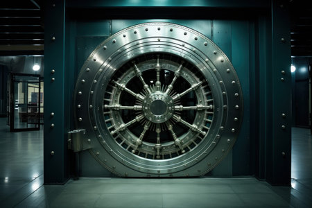 Close-up of a secure bank vault door with steel bolts and locking mechanisms, highlighting security. Generative AI