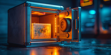 Open futuristic safe with a glowing orange lights revealing a secure metallic box inside in a high-tech environment.