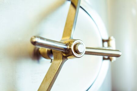 Vintage bank vault door with closed metal security safe box for storing valuable items