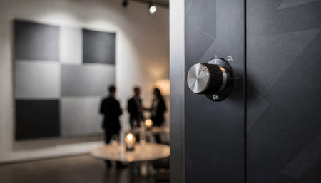 Medium shot showcasing sleek adaptive acoustic panels on gallery walls with control knobs clearly focused and the surrounding event setting softly blurred.