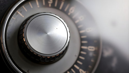 A close-up of limb a safe black combination dial set against a gray door. Focus is on precision and secure access. copy space.
