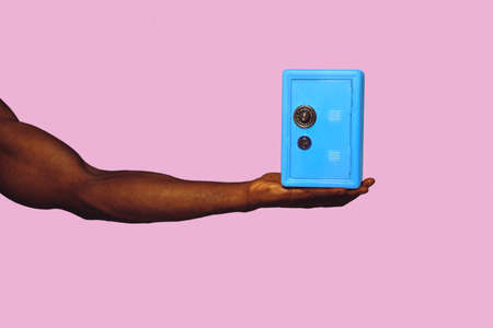 Safe, vault. Modern art collage in pop-art style. Hands isolated on trendy colored background with copyspace, contrast. Modern design with copyspace for advertising. Trendy colors.