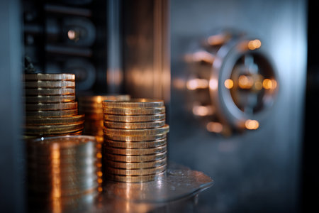 Open safe filled with coins on a dark background with blurred bank vault door and bokeh effect