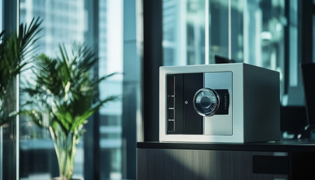 Contemporary office setting featuring a secure safe displayed on a stylish shelf