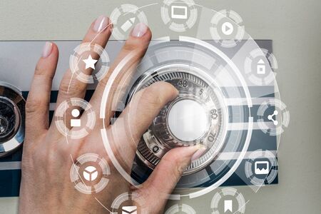 plate safe lock combination. Close up of a woman hand hold and tuning on a combinations safe dial lock.