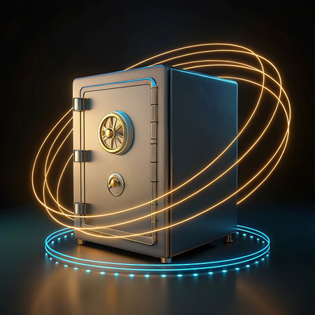 A sleek, modern safe with a metallic finish is positioned on a dark, reflective surface. It is encircled by several glowing golden rings that appear to be in motion, creating a dynamic visual effect. A subtle blue light emanates from the base of the safe, forming a circular platform.