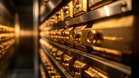 Close-up of a collection of gold bars arranged in a secure vault, with the emphasis on their lustrous surfaces and the secure environment.