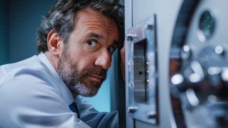 A man in a suit displays an anxious expression while leaning against a vault door, capturing a moment of tension in a secure financial setting.