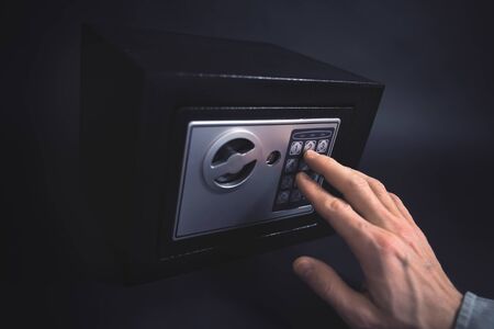 Cash Money Safe Deposit. Symbol of money safety. Man open small Residential Vault. Toned soft focus picture.