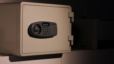 This image features a secure grey safe with a combination lock, symbolizing finance, protection, and safe storage for valuables in a home or office setting.