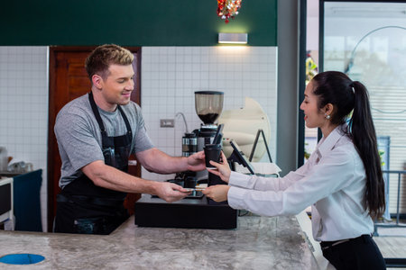 Barista man wear apron get paid and giving coffee cup to customers. Male at counter cafe talking service female customers.