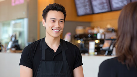 A smiling barista serves coffee in a modern cafe, creating a welcoming atmosphere with engaging customer interactions and providing an exceptional service experience.