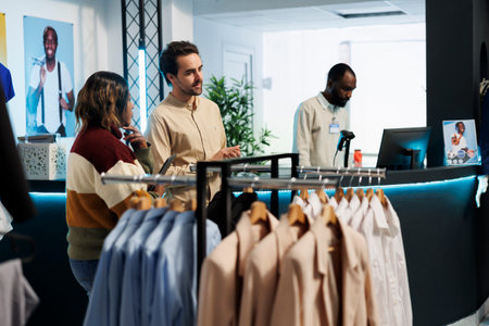Man customer holding smartphone showing mobile discount code to saleswoman while shopping in clothing store. Cashier scanning promo coupon while serving shopper at checkout counter