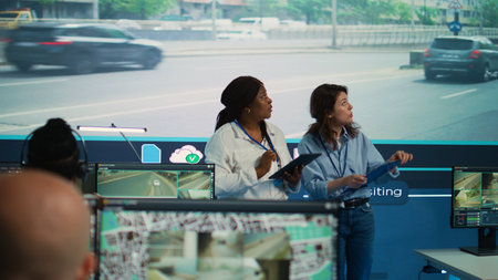 Team of control center employees gather intelligence about cars in traffic, monitoring the activity in the city via surveillance footage on CCTV security cameras. Infrastructure tracking. Camera B.