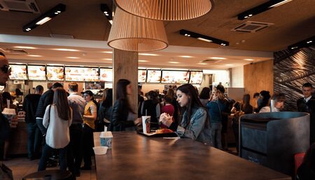 KYIV, UKRAINE - May 05, 2017: Young people have a rest and eating in a Mcdonald's in Kyiv, Ukraine. Mcdonald's is a very good place for young people. Illustrative editorial.