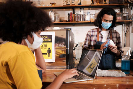 Two young cafe barista partners and entrepreneur work with face mask in coffee shop, waiting for customers order in new normal lifestyle service