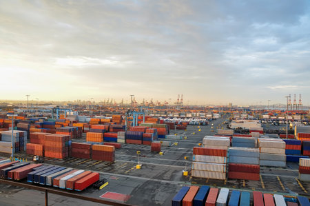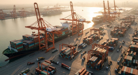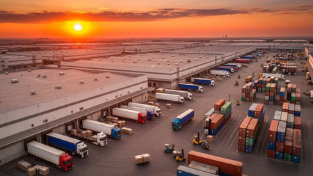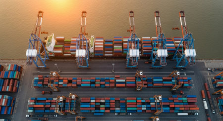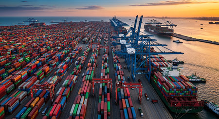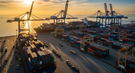 Colorful cargo containers sit in an industrial shipping port at sunset, waiting to be loaded onto ships