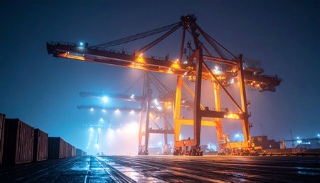 View of container ship and gantry cranes in harbor at night, Tacoma, Washington, USA