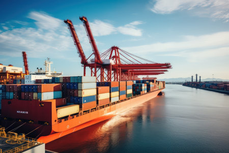 Container ship loading and unloading in deep sea port, Business logistic import and export freight shipping transportation by container ship in open sea.