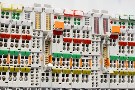 Detail of installed connector strip in electric cubicle. Electrical engineering of power station.