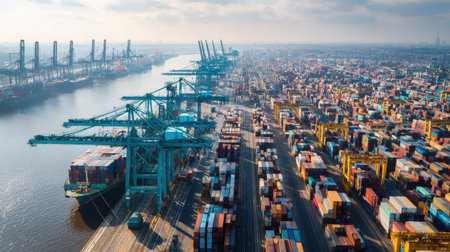 Aerial top view container ship in export and import business and logistics. Shipping cargo to harbor by crane.