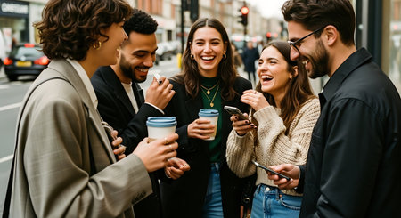 A group of young friends walking together on a city street laughing