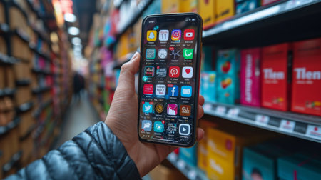 Female hand holding a smartphone with online shopping concept on the screen.