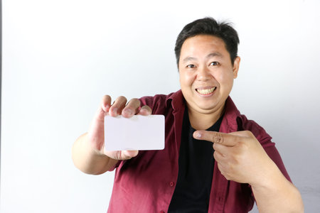 Happy Asian man poses in a studio setting, showcasing a plain credit card or gift card size item for a new product launch, promotion, or special offer announcement.